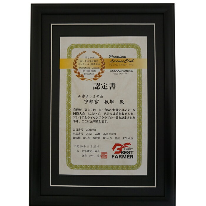 会員に与えられる認定の称号として、ベストファーマーの認定書を受けました! 山香ゆうきの会は毎年お米の食味分析を行い、日々試行錯誤しながら米作りを行っています。