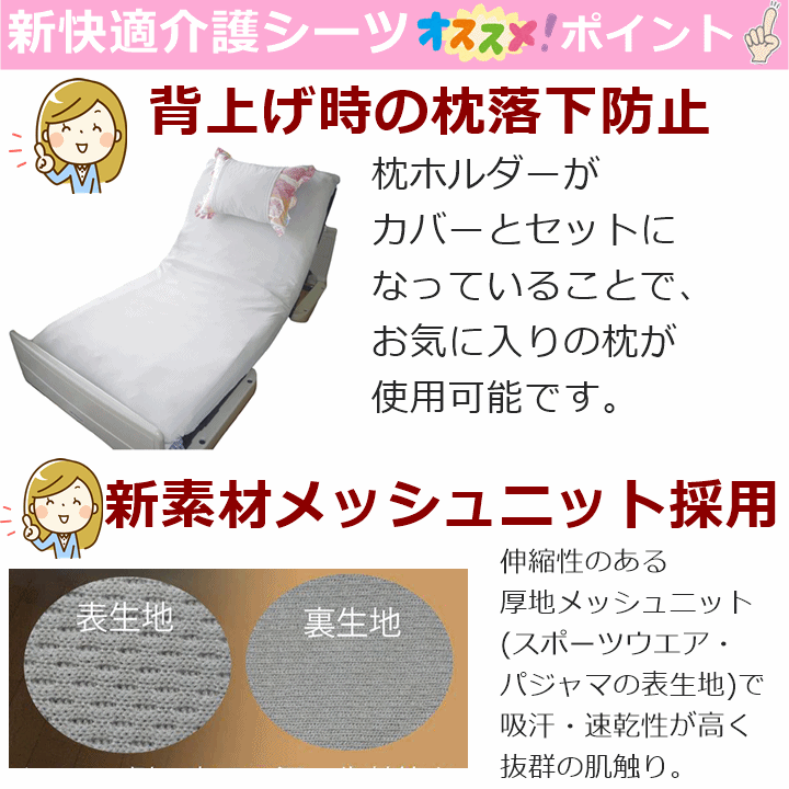 ■■■ ■■■ 商品詳細 工夫が詰まった介護シーツです ●まくら落下防止のまくらホルダーがカバーとセットに 背上げ時のまくら落下防止に、まくらホルダーがカバーとセットになっています。