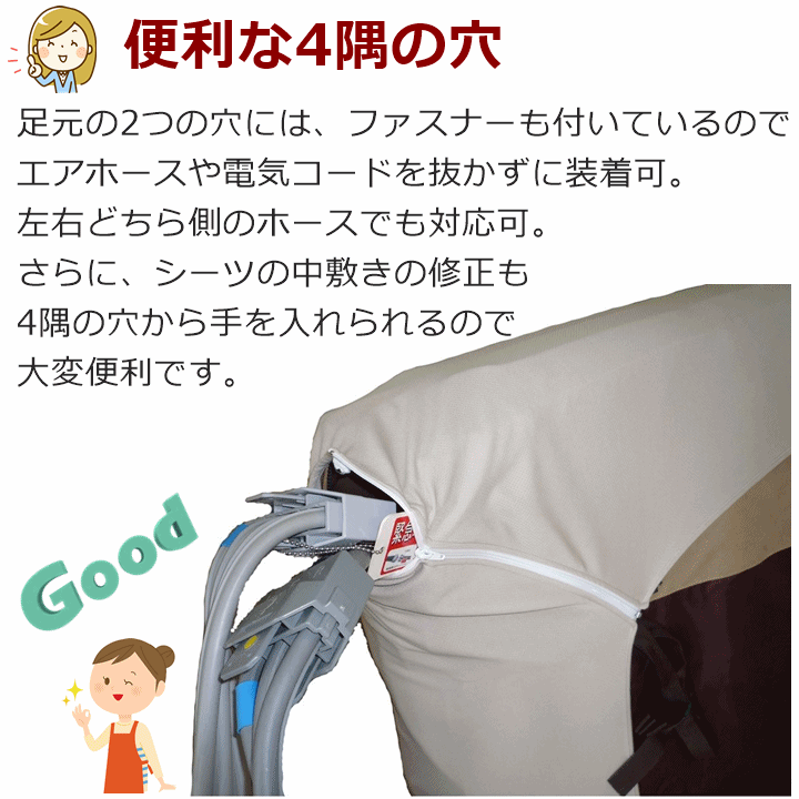 ●四隅の穴と二か所のファスナー 足側両サイドのファスナーで左右どちら側でもエアホースに対応。