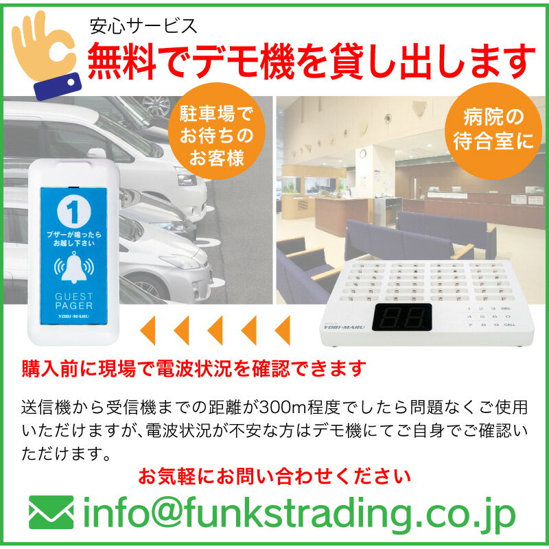 宜しければお客様のご意見やご感想をお聞かせくださいませ ・商品が到着したらレビューを投稿してみましょう ・レビューは購入履歴の画面からご投稿頂けます 購入履歴画面 ・レビュー内に、注文番号をご記入ください ・レビューの内容は当店のサービス向上などのために役立たせていただきます ■発送詳細 ●ゲストページャー「呼び丸」角形18台セットはこちら ●ゲストページャー「呼び丸」丸形15台セットはこちら
