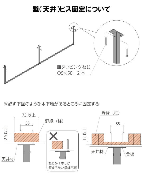 ・ブラケットの取付は、必ず木下地(野縁・柱・間柱)のある位置に行ってください。