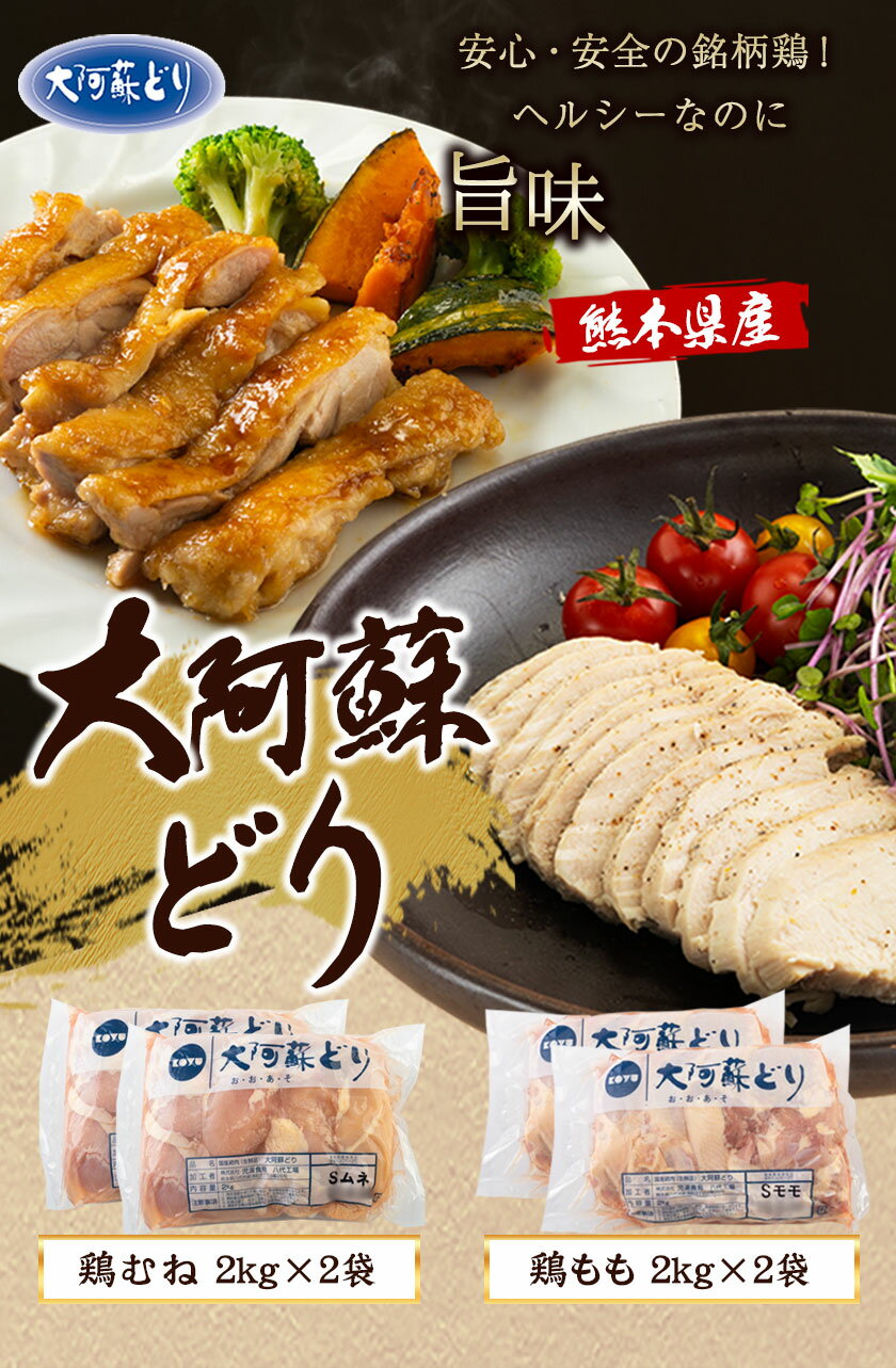 商品情報 熊本県産 大阿蘇どり 鶏もも 鶏むね 計8kg 名称 大阿蘇どり 産地 熊本県産 内容量 鶏もも 2kg×2袋鶏むね 2kg×2袋計8kg 賞味期限 パッケージに記載 保存方法 -18℃以下で冷凍保存 配送方法 冷凍便でお届けします。