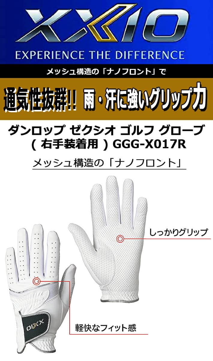 DUNLOP XXIO MEN'S GOLF GLOVE GGG-X017R ダンロップ ゼクシオ メンズ ゴルフ グローブ(右手用) ダンロップ ゼクシオ グローブ 通気性抜群! しかも雨・汗に強い! メッシュ構造の新開発「ナノフロント®」を 採用した全天候グローブ。